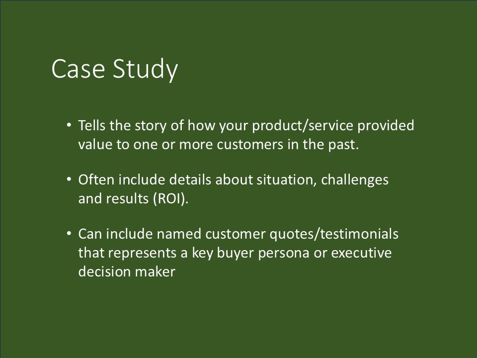 But even in the best of circumstances, a case study is less effective in the later stages of the sales cycle. A common customer pushback is “Sure your customers say great things about your product, but what will I get from it?” Actual mileage, as they say, may vary. You cannot rely on a case study to answer the customer’s executive team questions about expected payback.